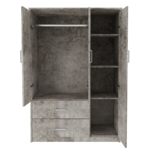 * Περιλαμβάνει δύο μεγάλες πόρτες με εσωτερική ράγα για κρεμάστρες και μία στενή πόρτα με 3 ράφια εσωτερικά. Στο κάτω μέρος φέρει δύο μεγάλα συρτάρια για την αποθήκευση ρούχων και αξεσουάρ.