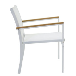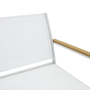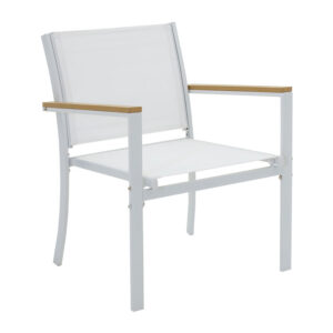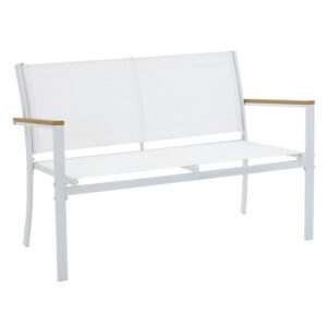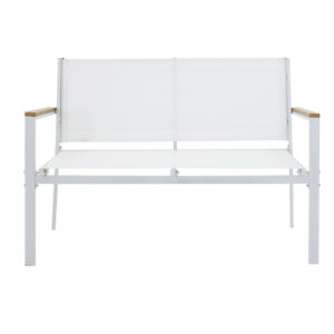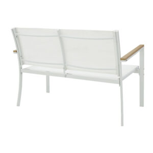* Ένα διθέσιο καναπέ, δύο πολυθρόνες με σκελετό από ανθεκτικό μέταλλο, συνθετικό ξύλο σε μπράτσα και άκρες τραπεζιού και επένδυση textilene σε χρώμα λευκό – φυσικό.