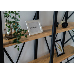 Φέρει ανθεκτικό μεταλλικό σκελετό στήριξης σε μαύρο χρώμα που αναδεικνύει καλαίσθητα το έπιπλο και ράφια από μασίφ ξύλο πεύκου.